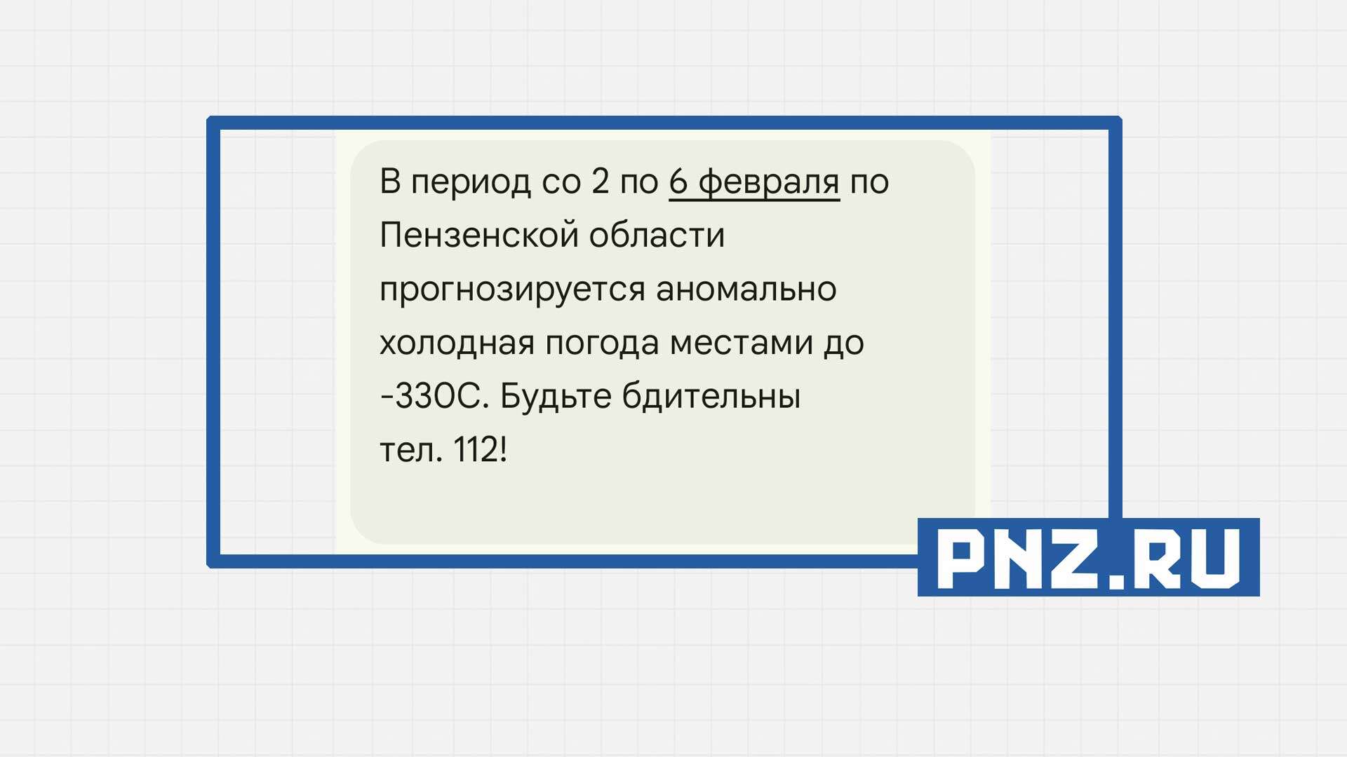 «В период со 2 по 6 февраля по Пензенской области прогнозируется аномально холодная погода местами до -330C. Будьте бдительны. Телефон 112», — указывалось в сообщении.